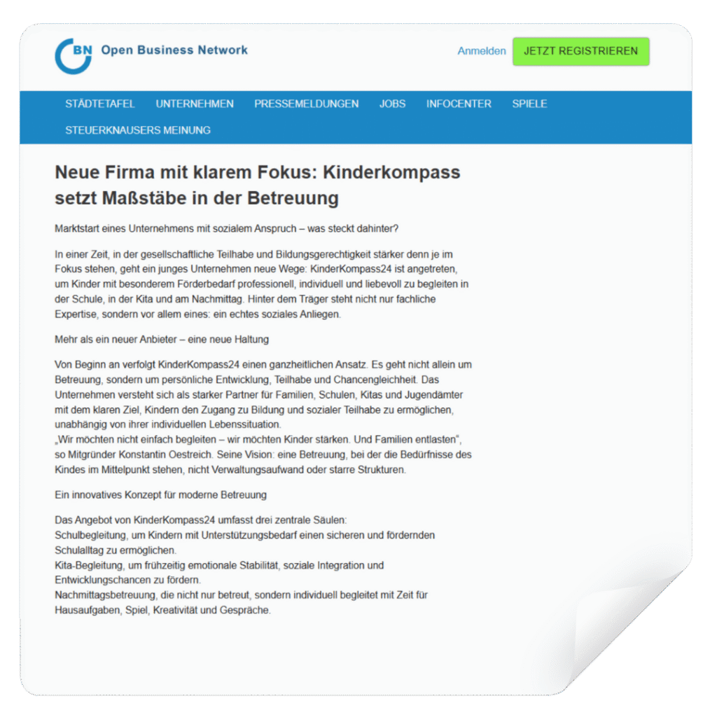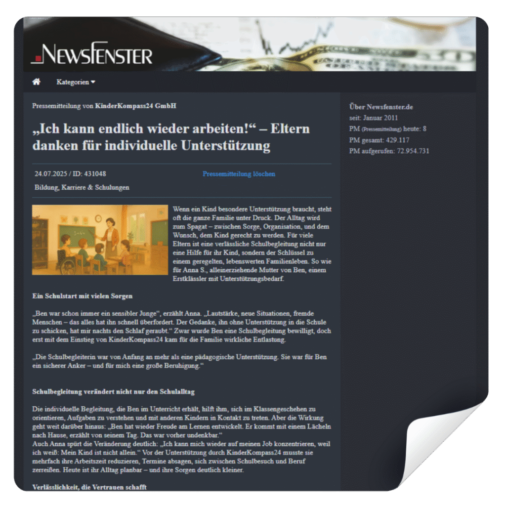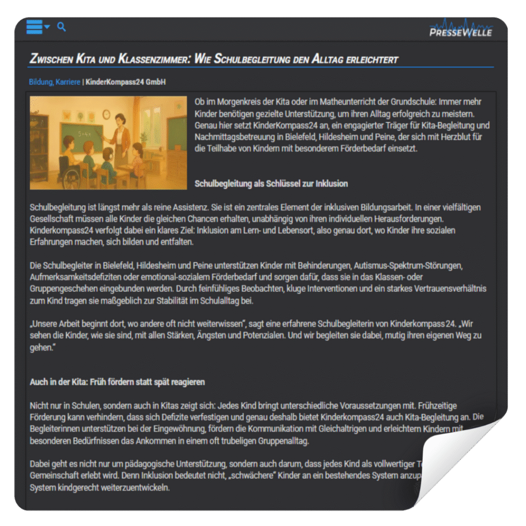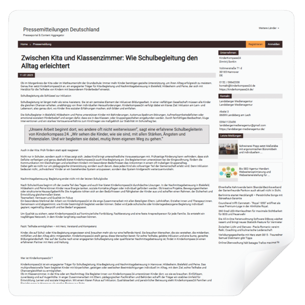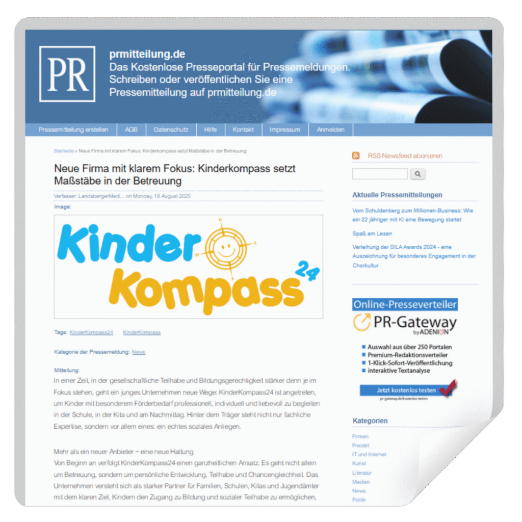 Auf unserer Presseseite finden Sie aktuelle Artikel, Veröffentlichungen und Medienberichte über KinderKompass24. Hier erhalten Sie Einblicke in unsere Arbeit, unsere Mission und die Wirkung unserer Kita- und Schulbegleitung. Wir zeigen, wie wir Kinder individuell fördern, Eltern unterstützen und gemeinsam mit Einrichtungen ein starkes Umfeld für Bildung und Entwicklung schaffen.