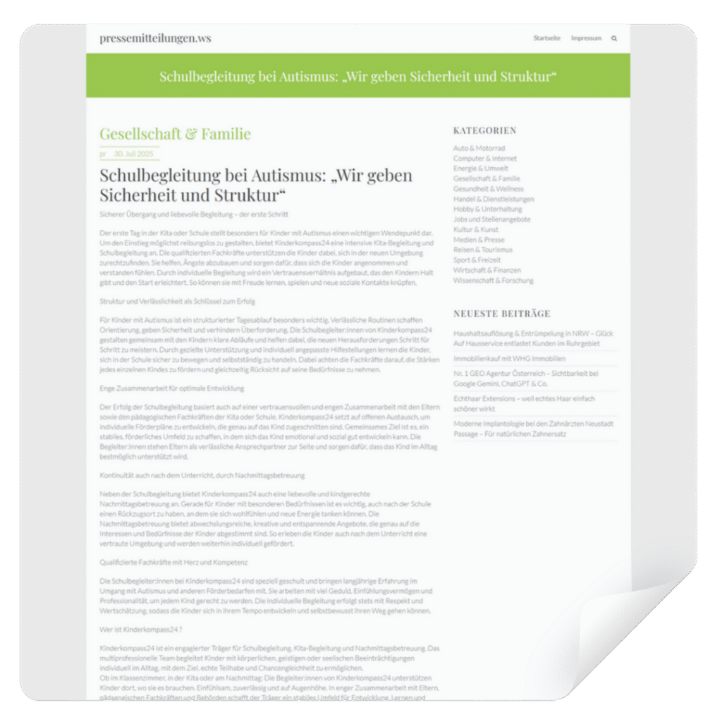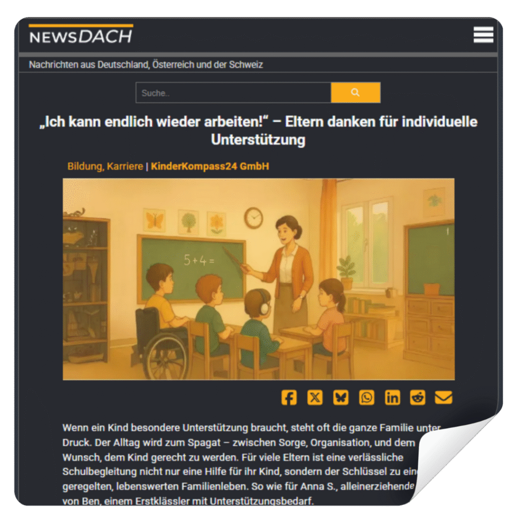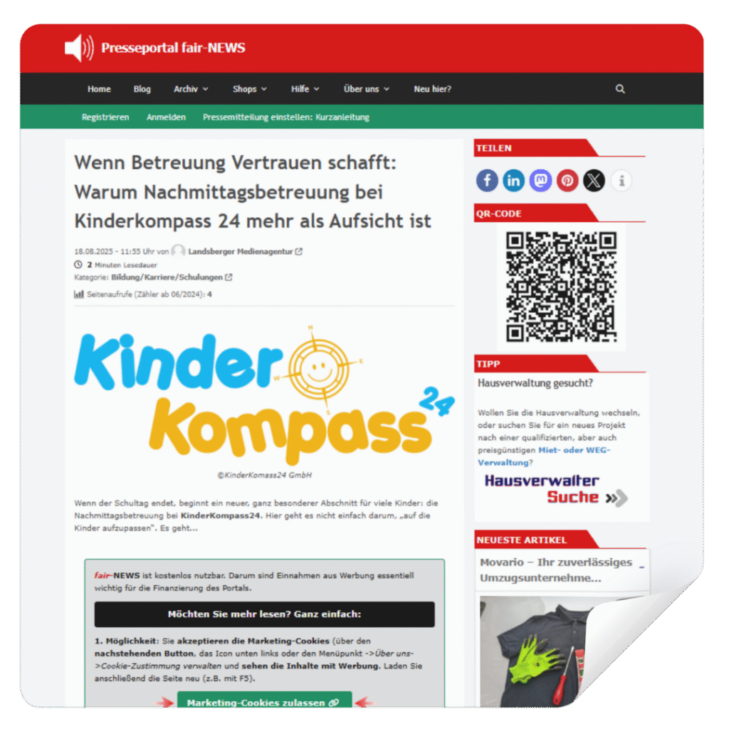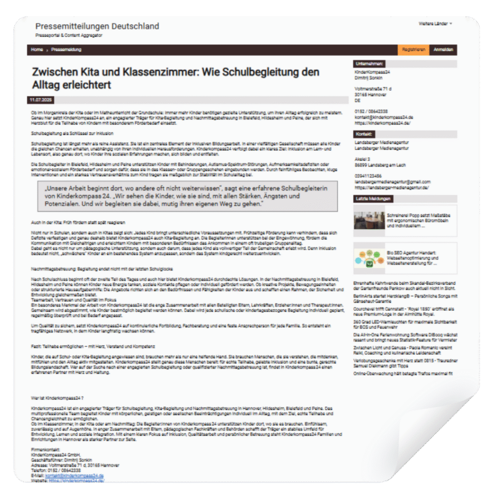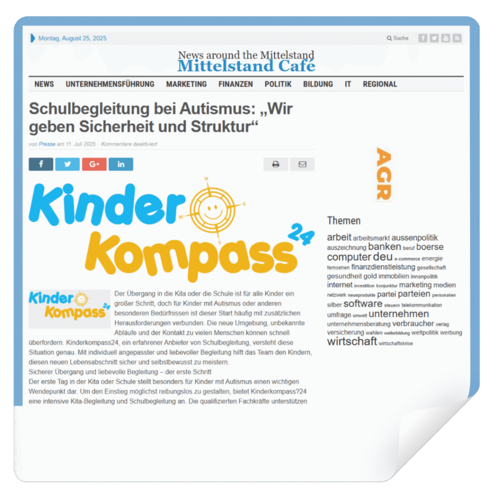 Auf unserer Presseseite finden Sie aktuelle Artikel, Veröffentlichungen und Medienberichte über KinderKompass24. Hier erhalten Sie Einblicke in unsere Arbeit, unsere Mission und die Wirkung unserer Kita- und Schulbegleitung. Wir zeigen, wie wir Kinder individuell fördern, Eltern unterstützen und gemeinsam mit Einrichtungen ein starkes Umfeld für Bildung und Entwicklung schaffen.