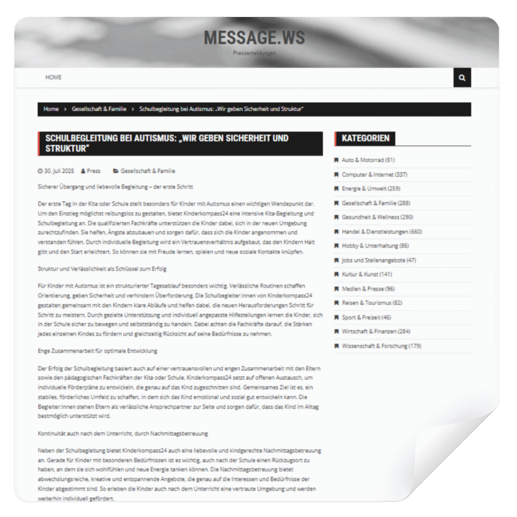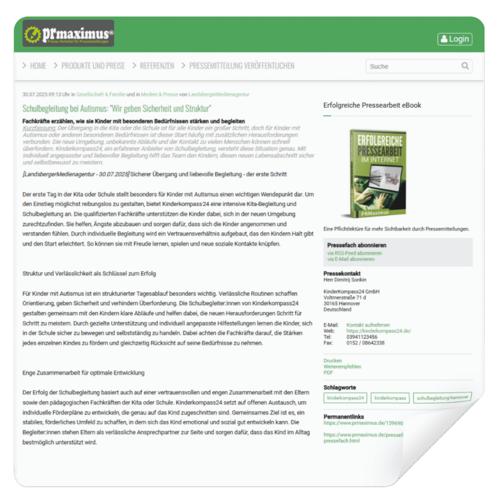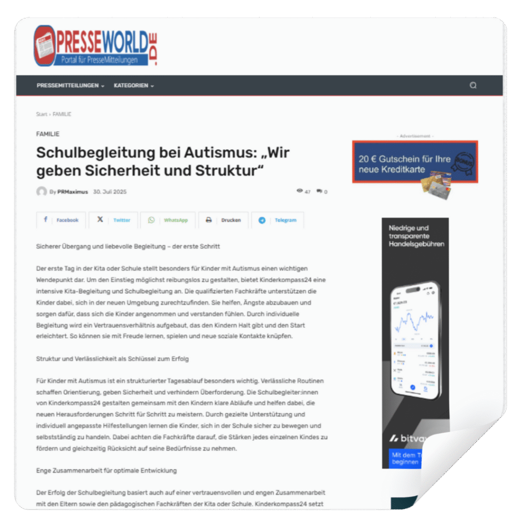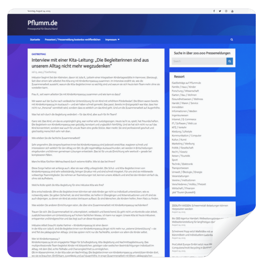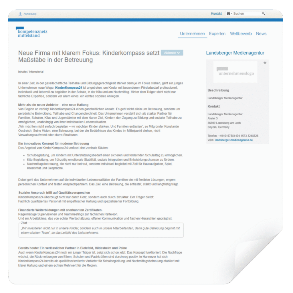 Auf unserer Presseseite finden Sie aktuelle Artikel, Veröffentlichungen und Medienberichte über KinderKompass24. Hier erhalten Sie Einblicke in unsere Arbeit, unsere Mission und die Wirkung unserer Kita- und Schulbegleitung. Wir zeigen, wie wir Kinder individuell fördern, Eltern unterstützen und gemeinsam mit Einrichtungen ein starkes Umfeld für Bildung und Entwicklung schaffen.