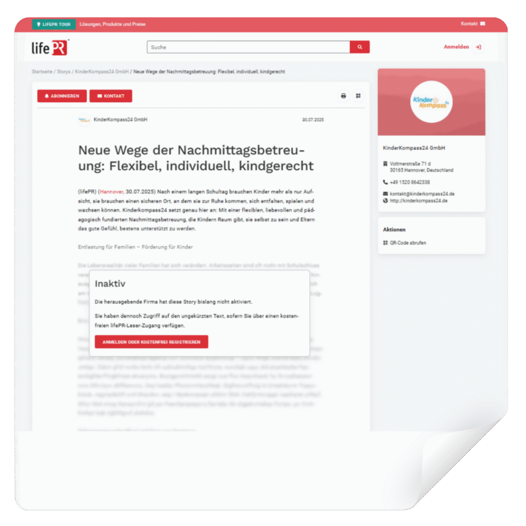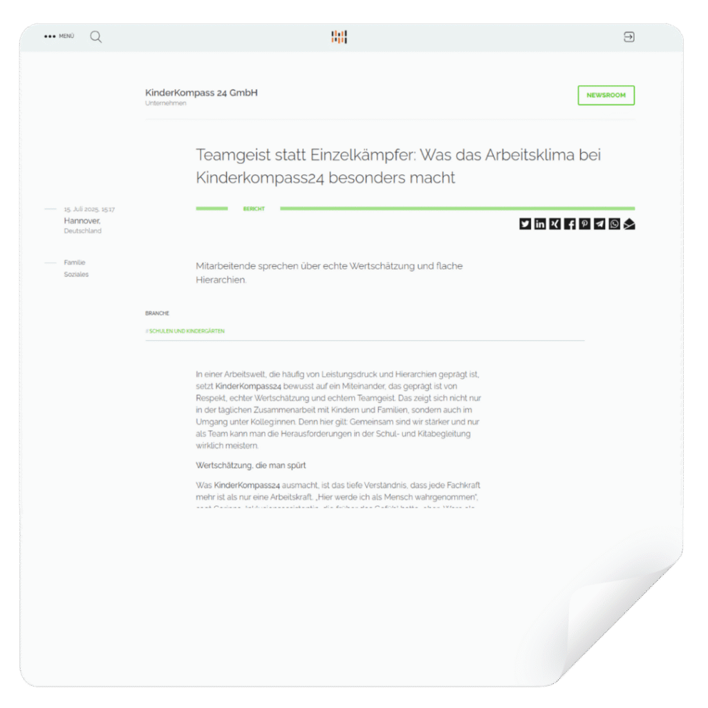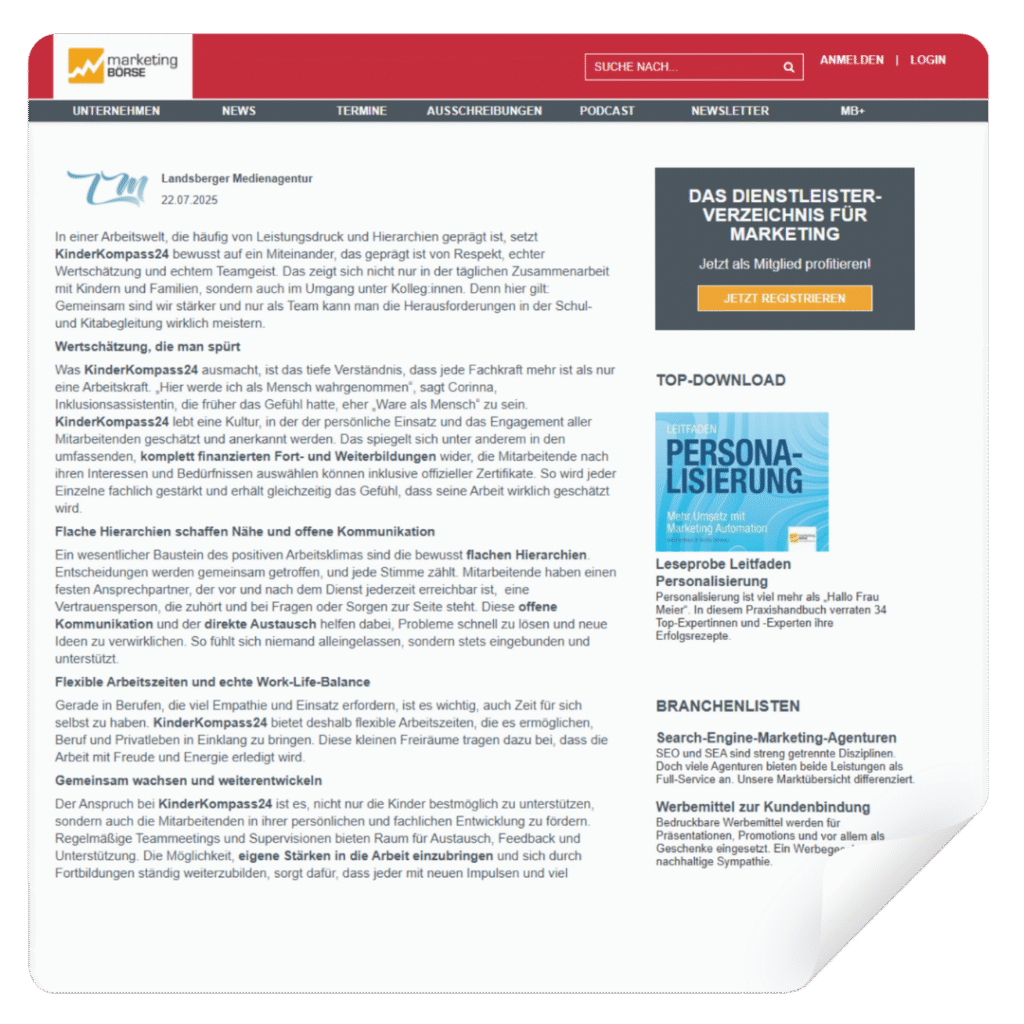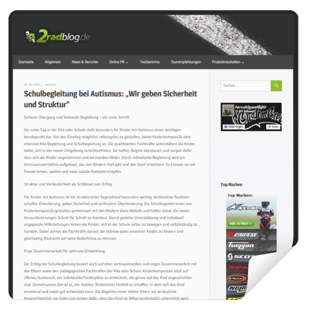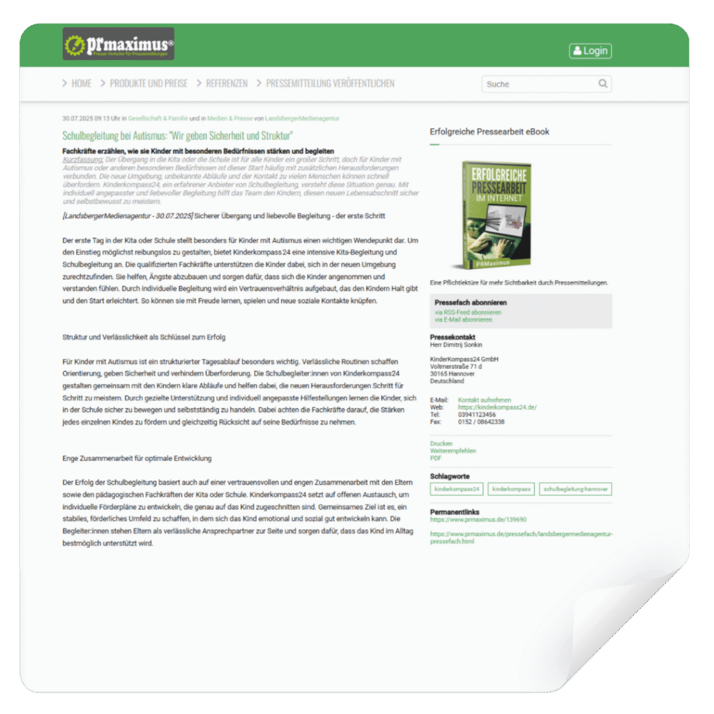 Auf unserer Presseseite finden Sie aktuelle Artikel, Veröffentlichungen und Medienberichte über KinderKompass24. Hier erhalten Sie Einblicke in unsere Arbeit, unsere Mission und die Wirkung unserer Kita- und Schulbegleitung. Wir zeigen, wie wir Kinder individuell fördern, Eltern unterstützen und gemeinsam mit Einrichtungen ein starkes Umfeld für Bildung und Entwicklung schaffen.